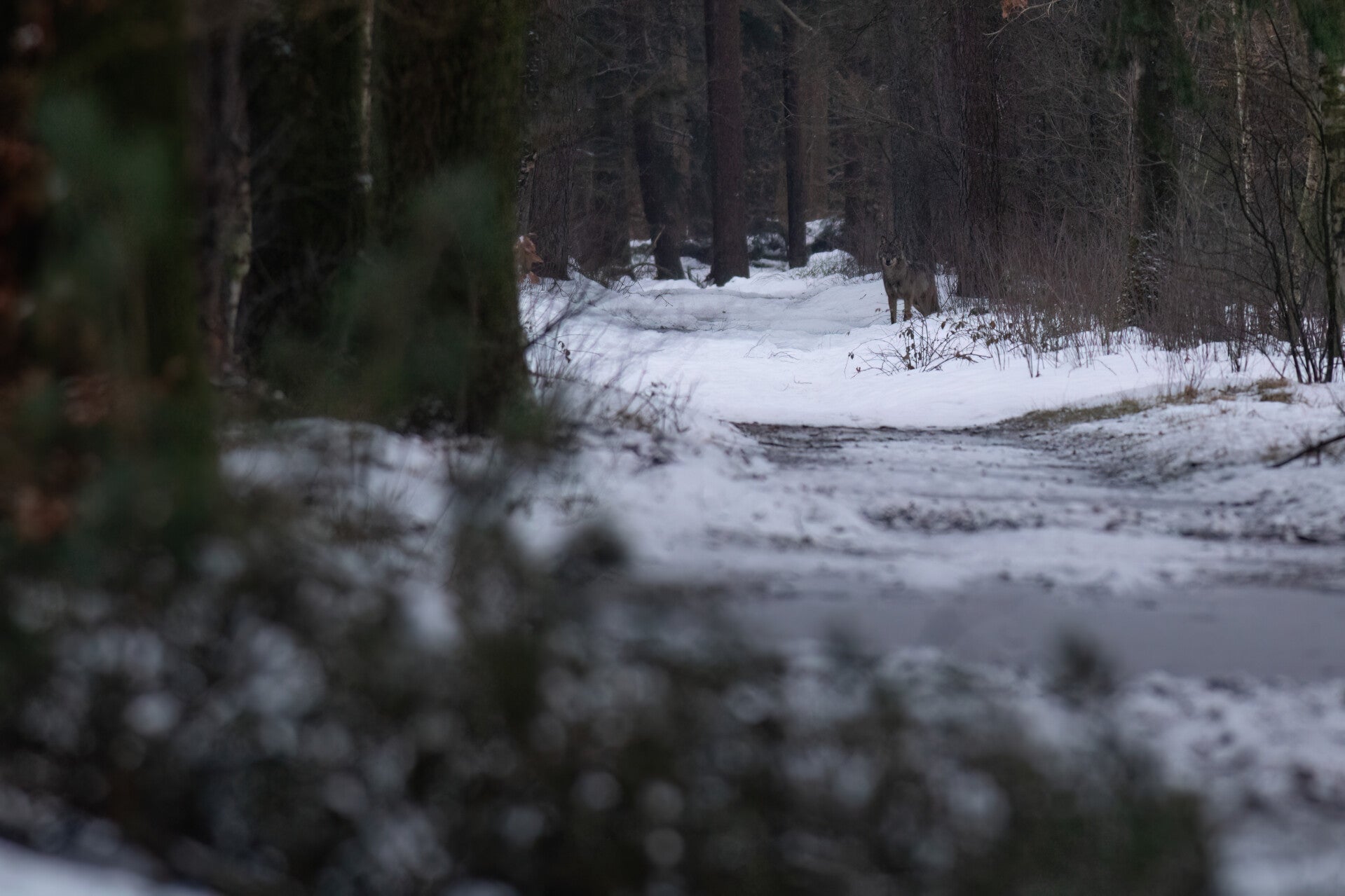 We hadden nog geen vijf stappen gezet of ja hoor: een wolf stak snel het pad over. Verbaasd bleven we staan en wachtten af. De sporen in de sneeuw lieten drie wolven zien… zou het echt? En of! Nog geen halve minuut later staken er twee wolven tegelijk het pad over. Echt waanzinnig. Een adrenalinegolf schoot door mijn lijf. Drie wolven bij elkaar, zomaar voor onze neus.