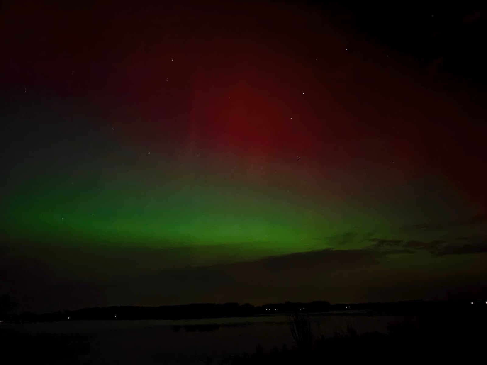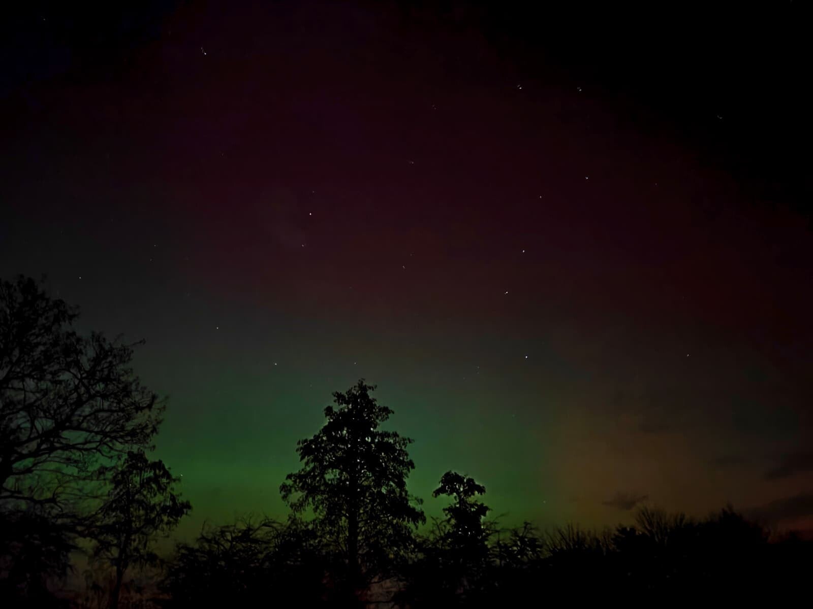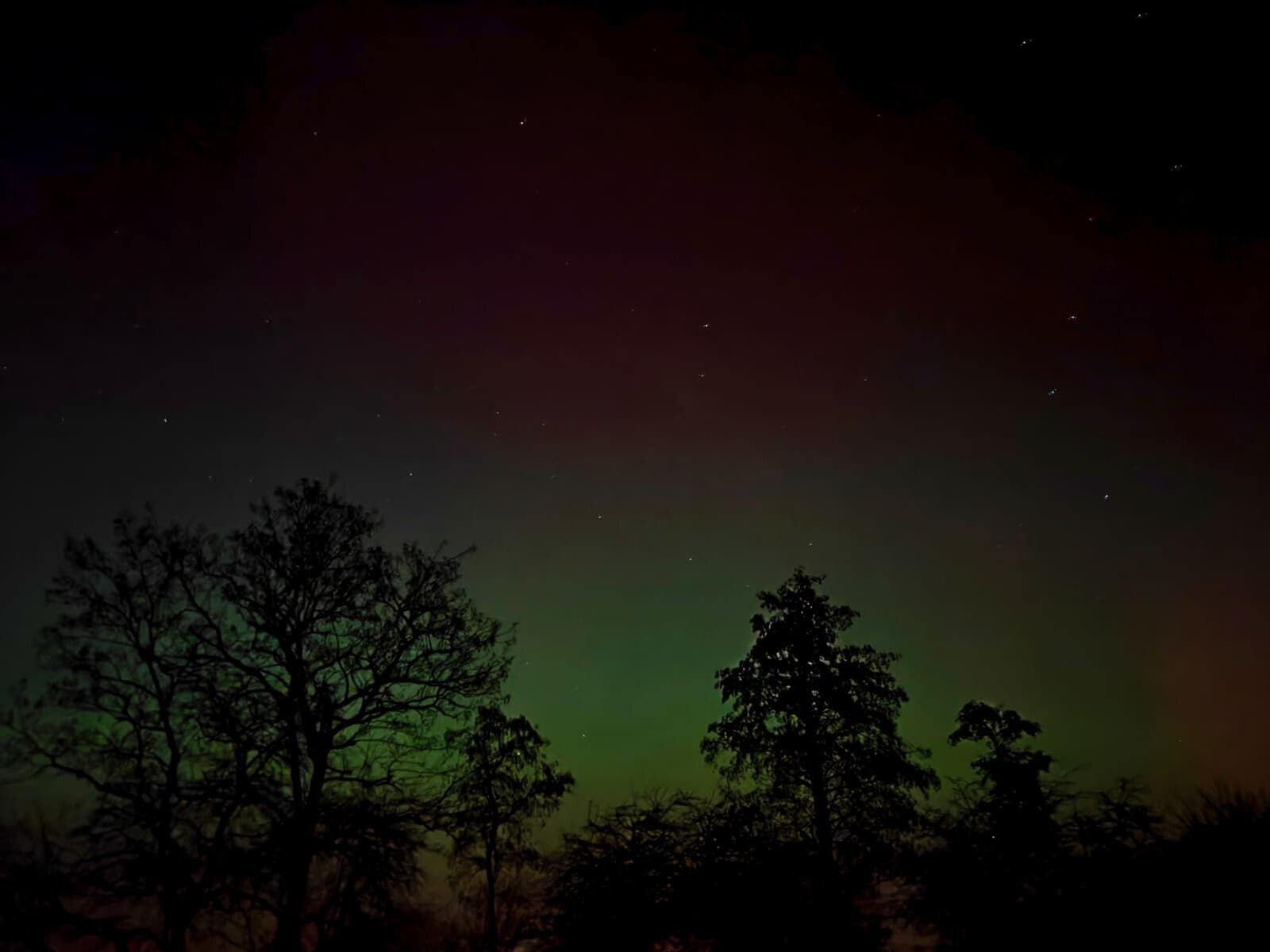 Eenmaal aangekomen in de polder leek de lichtshow alweer voorbij, maar gelukkig stond ik nog geen minuut stil of er verscheen opnieuw een groene golf boven mijn hoofd. Daarnaast hing er een rode gloed in de lucht, die met de telefoon zelfs nog beter zichtbaar was.